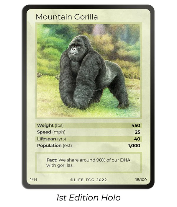 The game’s standout feature is its 1st Edition Holographic cards, printed in quantities matching the wild populations of featured animals. For instance, the Mountain Gorilla card, with only 1,000 copies reflecting the species’ estimated population, boasts a striking holographic design showcasing the gorilla’s soulful eyes against a misty jungle backdrop.
